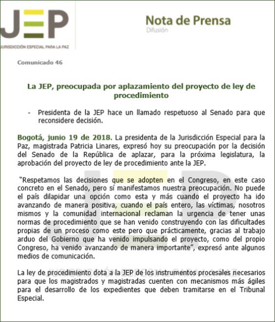 Esta decisión del Senado se presenta después del triunfo de Iván Duque en las elecciones  presidenciales,  hay  que recordar que el partido político que representa ha expresado en varias oportunidades su voluntad de hacer trizas el Acuerdo de paz.